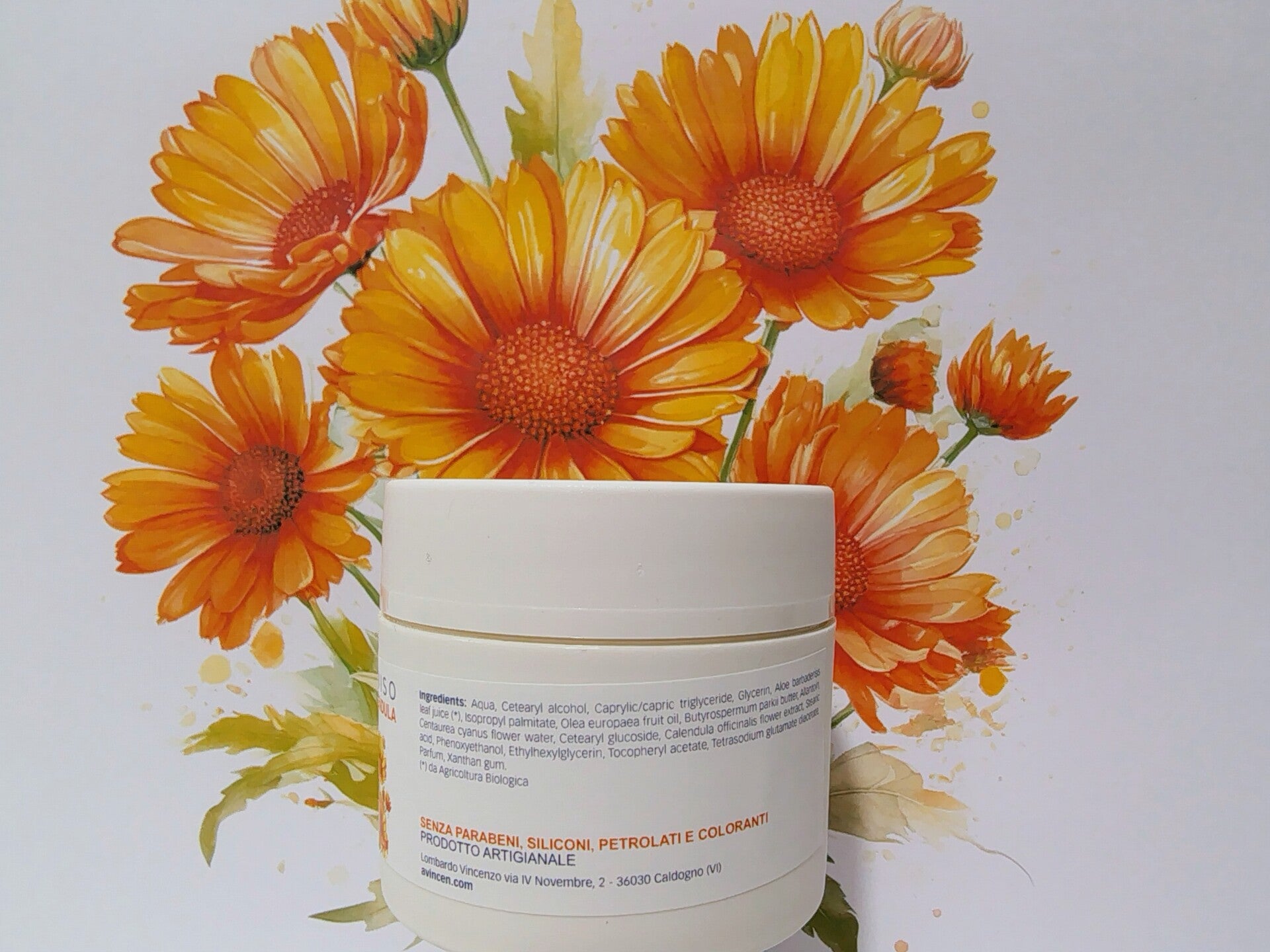 La Crema Viso alla Calendula è un trattamento cosmetico ideale per tutti i tipi di pelle. Grazie ai suoi ingredienti semplici e naturali, provenienti da Coltivazioni Selezionate con diligenza e perizia per garantire delle materie prime di altissima qualità. La crema contiene Calendula, Aloe Bio, Fiordaliso, Olio Extravergine d’Oliva e Burro di Karité, che si prendono cura della pelle in maniera dolce e delicata. È perfetta per l’uso quotidiano sia su pelli giovani che mature.