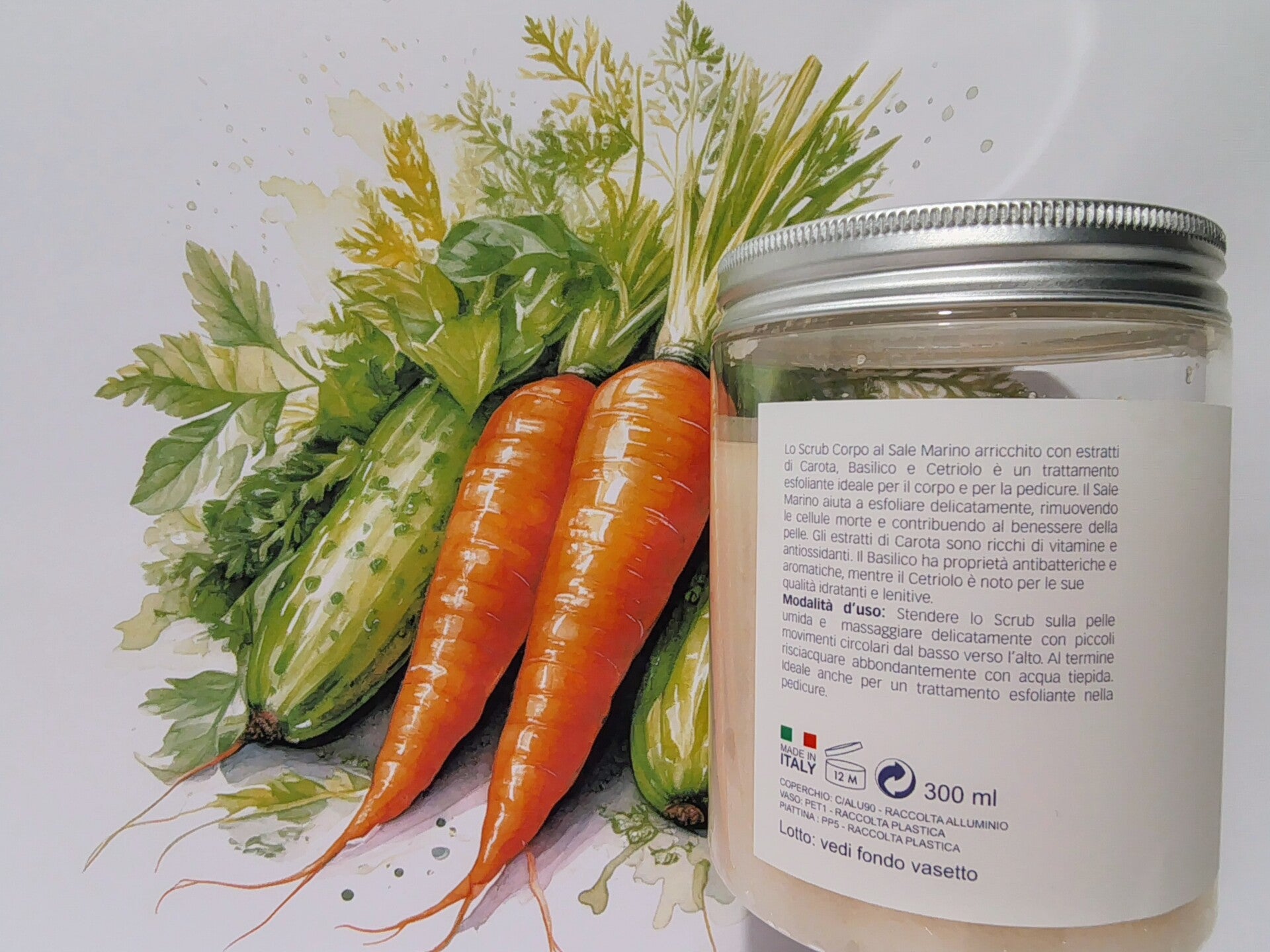 Lo Scrub Corpo al Sale Marino arricchito con estratti di Carota, Basilico e Cetriolo è un trattamento esfoliante ideale per il corpo e per la pedicure. Il Sale Marino aiuta a esfoliare delicatamente, rimuovendo le cellule morte e contribuendo al benessere della pelle. Gli estratti di Carota sono ricchi di vitamine e antiossidanti. Il Basilico ha proprietà antibatteriche e aromatiche, mentre il Cetriolo è noto per le sue qualità idratanti e lenitive. Modalità d’uso: Stendere lo Scrub sulla pelle umida e massaggiare delicatamente con piccoli movimenti circolari dal basso verso l’alto. Al termine risciacquare abbondantemente con acqua tiepida. Ideale anche per un trattamento esfoliante nella pedicure.