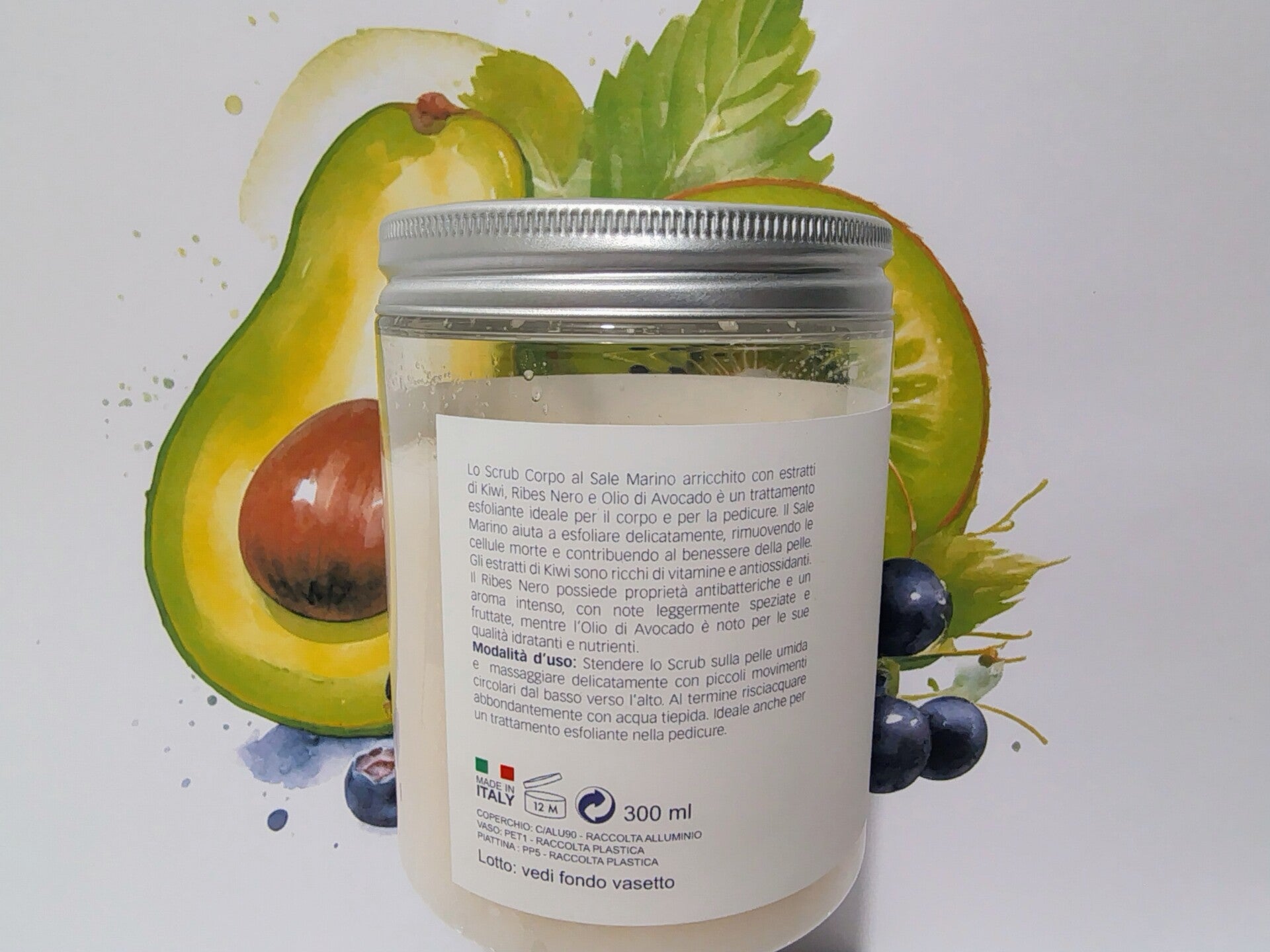 Lo Scrub Corpo al Sale Marino arricchito con estratti di Kiwi, Ribes Nero e Olio di Avocado è un trattamento esfoliante ideale per il corpo e per la pedicure. Il Sale Marino aiuta a esfoliare delicatamente, rimuovendo le cellule morte e contribuendo al benessere della pelle. Gli estratti di Kiwi sono ricchi di vitamine e antiossidanti. Il Ribes Nero possiede proprietà antibatteriche e un aroma intenso, con note leggermente speziate e fruttate, mentre l’Olio di Avocado è noto per le sue qualità idratanti e nutrienti. Modalità d’uso: Stendere lo Scrub sulla pelle umida e massaggiare delicatamente con piccoli movimenti circolari dal basso verso l’alto. Al termine risciacquare abbondantemente con acqua tiepida. Ideale anche per un trattamento esfoliante nella pedicure.