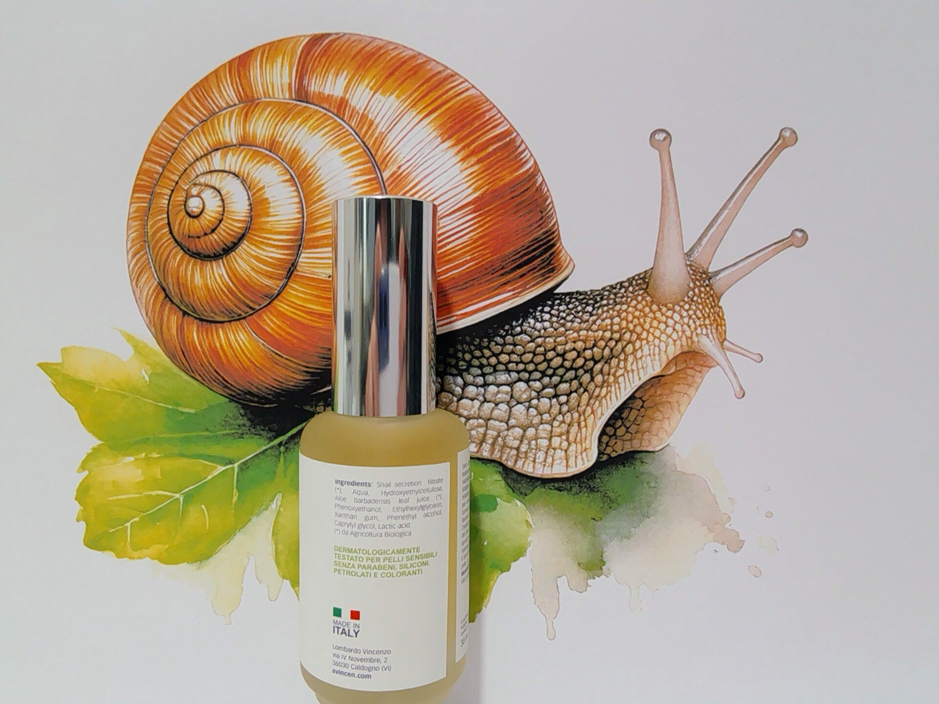Ingredients: Snail secretion filtrate (*), Aqua, Hydroxyethylcellulose, Aloe barbadensis leaf juice (*), Phenoxyethanol, Ethylhexylglycerin, Xanthan gum, Phenethyl alcohol, Caprylyl glycol, Lactic acid. (*) da Agricoltura Biologica